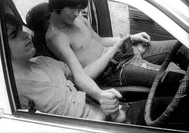 There’s a veritable treasure trove of dynamic visual potential what with the driver nearing a point when he will ejaculate onto his shirt and abdomen with his friend following suit shortly thereafter. Add to that the transgressive bonus points of being in a car and therefore implicitly in public gives the proceedings a deliciously transgressive charge.