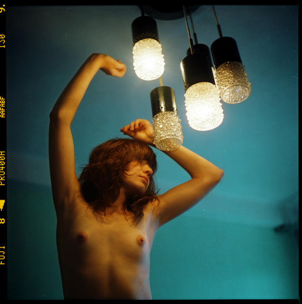 That’s what I love about this image. Fuji Pro 400H is a daylight balanced color negative stock. But the primary source of illumination comes from Tungsten bulbs in the overhead fixtures. This pushes the daylight on the ceiling and wall blue-green, while tinging the young woman’s skin orange.