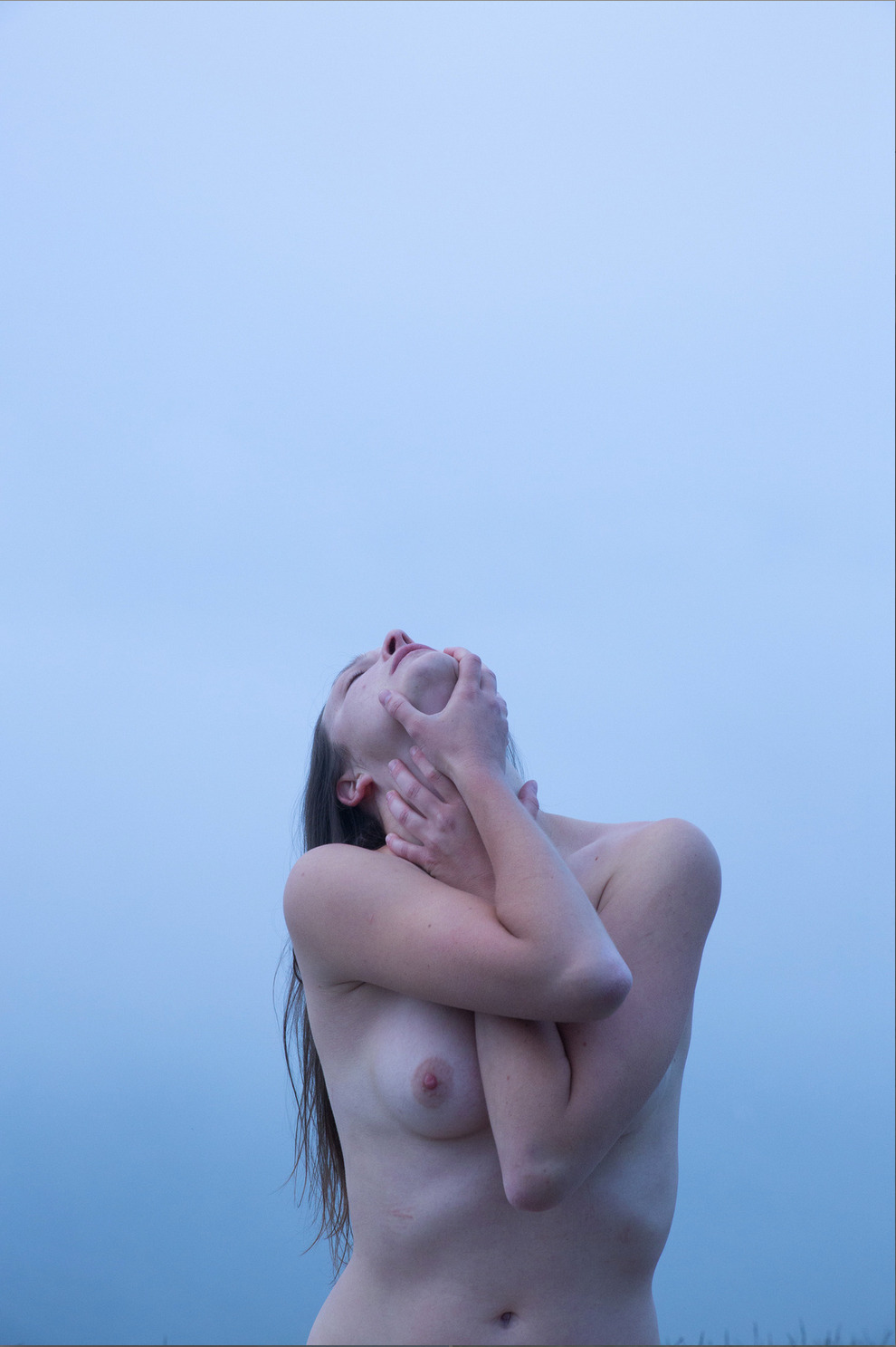 I LOVE the way it’s both flat–the subject in the foreground and the blue-white gradient of sky in the background–at the same time there is this weird dimensionality to it. (I mean look at her right elbow blocking her left forearm and how that suggests spatial cues that contribute a palpable sense of her right nipple, right breast and upper body all offset by the hair trailing down her back behind her.