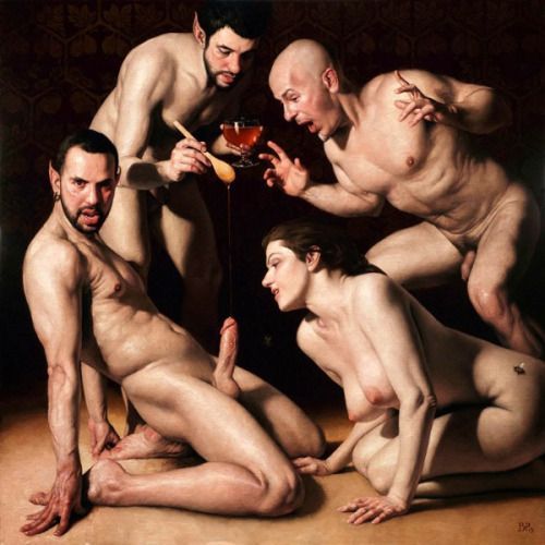 And that’s not to say this completely works. Ostensibly, the fellow on the top left is ladling honey out of one of wide mouth wine glass with a wooden spoon and letting it drip onto the engorged glans of the man on the lower left. (Note: the wine glass bears more than a passing resemblance reminds me to a similar object in Vermeer’s The Wine Glass.)
