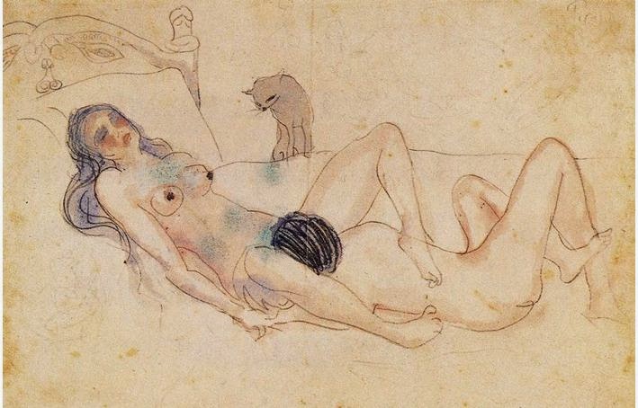 Gustav Klmit, Egon Schiele and Picasso all made v. similar sketches, actually. And the thought that suggests to me is that Schiele was probably the most honest about what he was up to–since there’s less discrepancy between what he exhibited publicly and what he mediated upon privately. Klimt and Degas were more interested in attempt to present sexuality organically within a proscribed context–one facet in a many faceted presentation. (And the Picasso drawing in the ambiguity of the depiction of the person performing oral sex on the woman preserves an undifferentiated, ambiguously gendered person that can serve as both signifier of a woman or a place holder for a man–which seems to be entirely in keeping with Picasso’s legendary misogyny.)