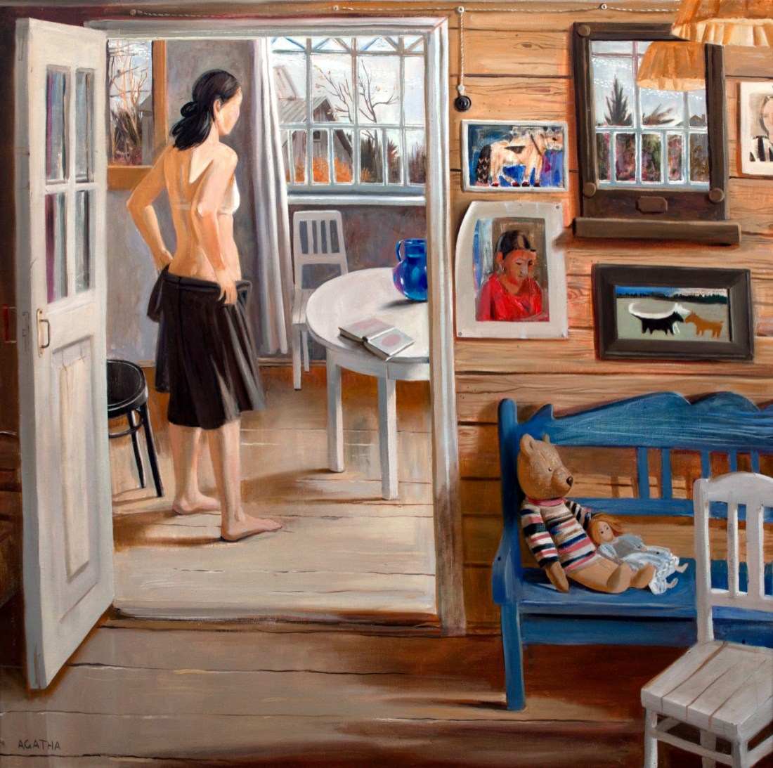 This is brilliant for a number of reasons. It opens the frame. It implies the viewer as voyeur. It also cleverly enhances the direction of the light. For example the light in the reflection of the window along the fourth wall is brighter than the light seen through the window in the background–which would be what you would expect given the angle of the shadow the woman is casting.