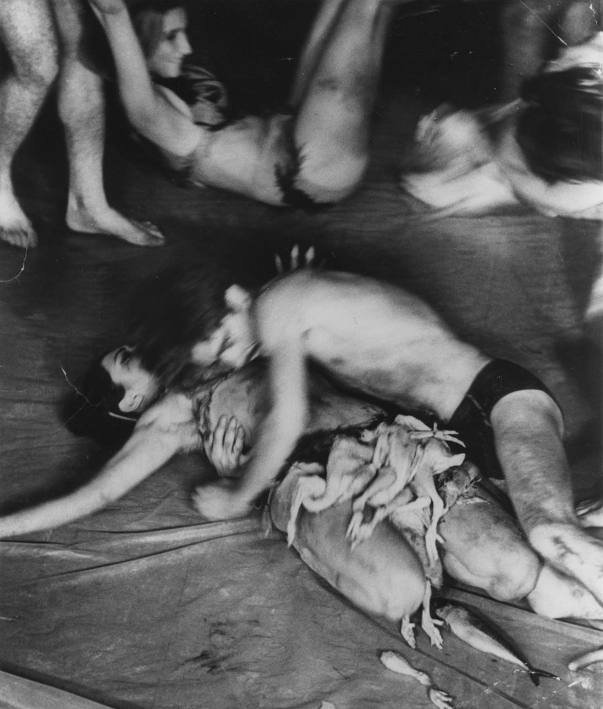 Before seeing this photo, I was not familiar with Meat Joy–wherein eight people dance and play with paint, sausage, fish and raw chicken in an improvised erotic rite.