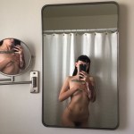 I’d term it a self-portrait, not a selfie–partly because Nacke is framing her shot so that it including two mirrors featuring her reflection, instead of using her phone as if it were a mirror to find and capture her shot, partly because unlike the ubiquitous me-nude-in-my-bathroom mirror trope, the reflection of the nude subject is not ostensibly the only subject.
