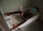 I have mixed feelings on the camera angle. Yes, the sort of God’s eye view is conceptually resonate; however, the angle of the corners of the niche the tub is installed into with a sort of 3 point perspective look is a little too forceful. (If it’s not clear what I mean compare the visuals in a Sam Raimi or Robert Rodriguez film–or Bayhem, for that matter–and compare it with the visuals in Hitchcock or Kubrick’s work. Although I think it is actually worth noting that the composition in Willow’s images being more like Raimi or Rodriguez and the way in which those creators are more closely tied to genre and visual conventions lifted from comic books…)
