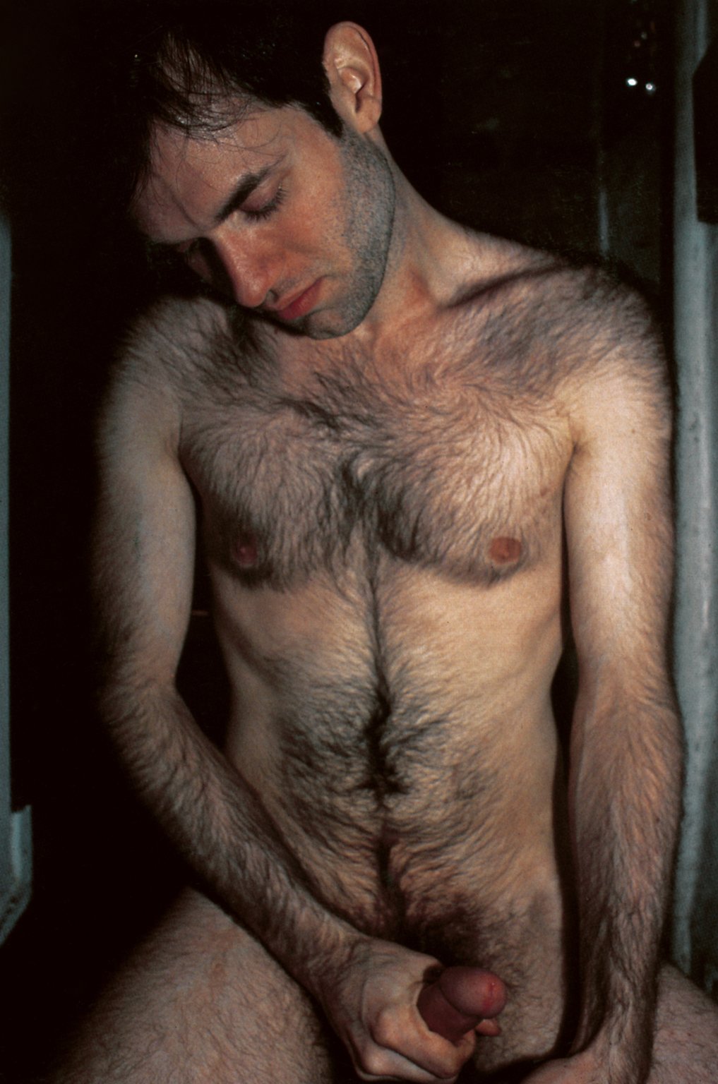For example: this image with its ontological title is all lurid flash bulb and exposed sweating skin—very fucking rock and roll. A boy lit up, frozen in the act of massaging his testicles with his left hand and stroking his erection with his right.
