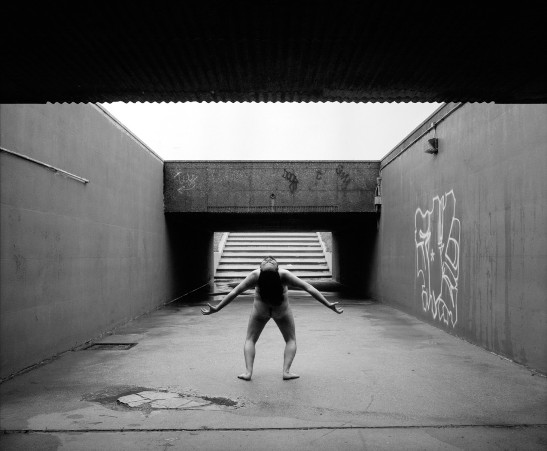 There’s an intoxicating variety of sumptuous texture–poured concrete, mortar, corrugated metal, skin, hair and fabric. (It’s an especially inspired touch that the lines on the tartan print blanket reiterate the two point perspective of the composition, but in their slightly imperfect alignment, they server to further direct attention toward the subject.