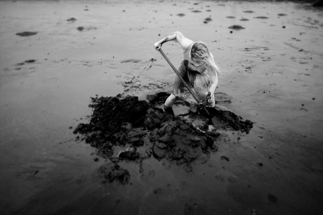 Visually, this is a dynamic image. There’s a sense of heft and twist and flex of the physical motion conveyed in the pose. The mud streaked skin and fabric as well as the earth that has been cast aside all indicate this is only the beginning of a grueling task.