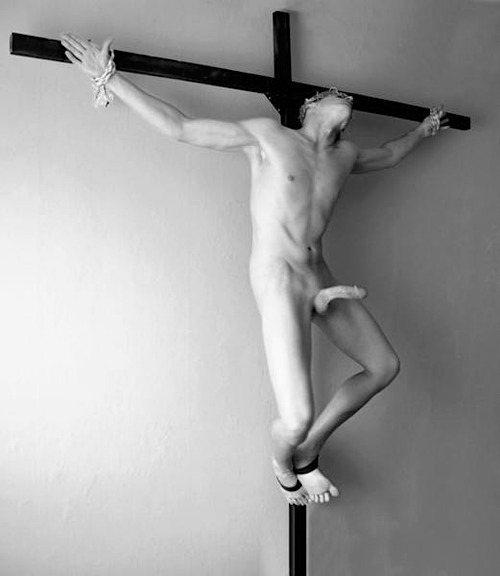 The pattern of the tile and it’s alignment with the upholstery of the table is one of the reasons the composition more or less works–the eye scans left to right and the snaking chain attached to the shackle around his scrotum pulls the eye back across the image emphasizing the off kilter angle.