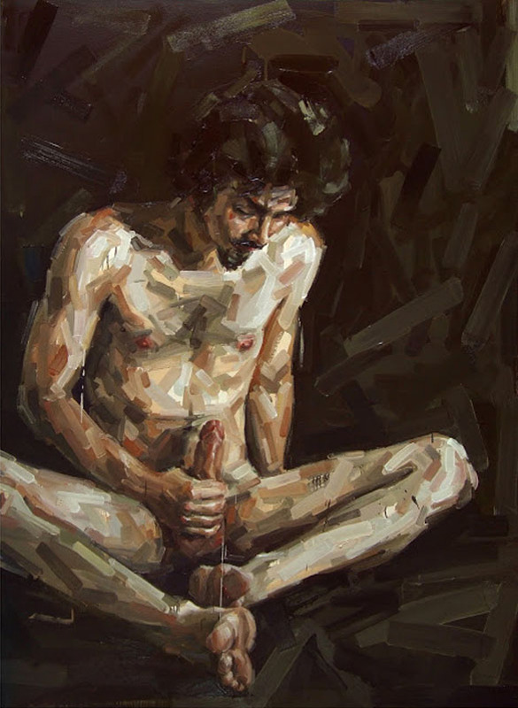Honestly, I’m so enamored with his preoccupation with genitals and masturbation as motifs, that it’s difficult for me to step back and look at the work critically. If I do that, however, there’s some weird stuff going on. The linear application of paint–which often reminds me of band-aids, tends to remain broad and nebulous around the edges, become more refined as the shape of the subject is defined.