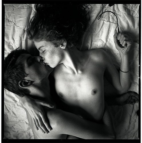 The trick that makes a skinny frame work here is the narrow triangular form of the overexposed motion blur adorning his hands and her left side would–in a wider frame–be subject to de-emphasis. Further, the vertical framing draws attention to the discarded clothes piled on the bedside table and likely Russian electrical outlet.