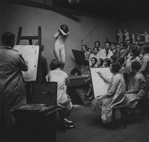What is fascinating is how that outward tension is then countered by the fact that all the eyes in the room are on the model—which immediately draws the eye back to her. Also, Cazneaux strategically positions the pencil held by the seated sketching woman toward the model’s mons pubis.