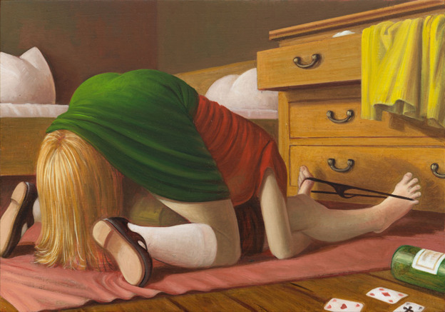 Really, it’s probably the affronting style of the rest of his work that made him decide to build in a method of escape should he face criticism for the depiction, but honestly, save for the manner in which the girl on the bottom’s thong is positioned around her feet, there’s a matter-of-factness that’s worthy of Balthus–even if Balthus would’ve almost certainly rendered something more graphic than Gernegross’ explicit implications. But then Balthus’ was more interested in the ambiguity his work instilled in his audience than in ambiguity as a safety net against critical backlash.