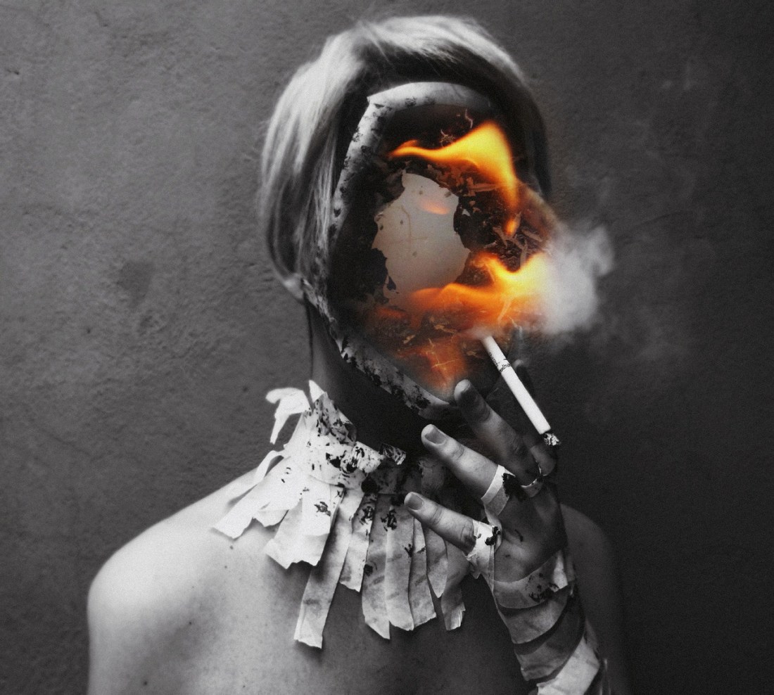 This is fantastic for the way it constantly turns in on itself. The lit B&W cigarette resonates with the flame burning through a print. (This appears to be a collage effect, where the picture of a burning print has been digitally imposed over the B&W portrait–creating a mask that is in turn a void with dimension deeper than the image on which it has been overlaid; like one of those haunted houses that is bigger on the inside than the outside.)