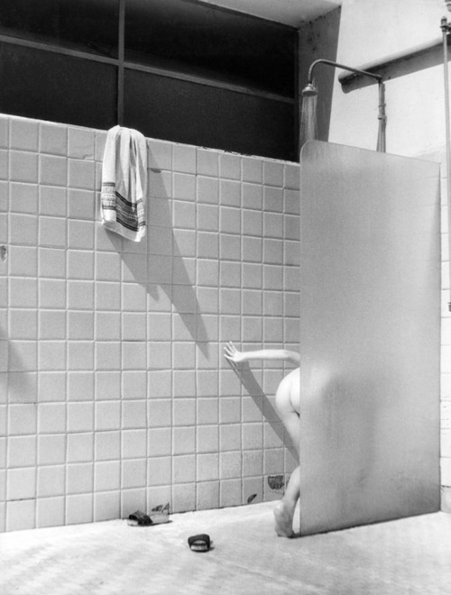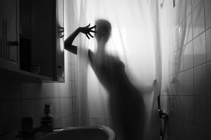 The point is–what we see we see only in relation to the way light interacts with it. The only source of light in this is presumably the window behind the shower curtain and the subject.