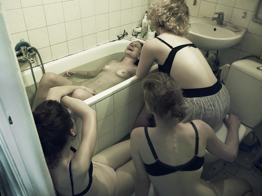 The I is naked. The III are all wearing black bras. I is in the tub. III are gathered around it. The III form a natural triangle which points away from the one–adding an extra sense of loneliness and isolation to her plight.